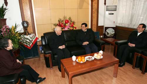 前天下午,中共中央總書記、國家主席、中央軍委主席胡錦濤,分別看望了朱光亞和楊樂兩位著名科學家,聽取他們對中國科技事業發展的意見和建議,向他們和全國科技工作者表示親切問候和新年祝福。