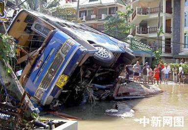 圖為海嘯席卷泰國普吉島后,被掀翻毀壞的大巴車。