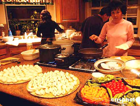 美國洛杉磯的一個華人家庭在圣誕節之夜舉辦家庭沙龍,親朋好友在廚房包中國餃子,在這個西式節日里享受中國傳統美食。賈國榮 2004-12-26 12:43:25