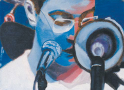 竇唯還特別喜歡用畫描繪自己樂隊(duì)演出時(shí)的景象,在昨日曝光的作品中就有兩幅。從畫面上看,一組搖滾樂隊(duì)正在舞臺(tái)上盡情揮灑激情,而臺(tái)下的觀眾也投入欣賞。另外一幅自畫像更是惹眼,藍(lán)色是畫的基調(diào),畫中的竇唯掩在兩只話筒后面,低頭正沉醉地低唱著。總的看來(lái),竇唯的小畫未必惹眼但很精妙。不賣不展