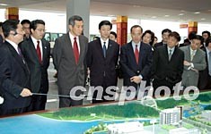 前來參加中新聯(lián)合協(xié)調(diào)理事會第七次會議的新加坡共和國副總理李顯龍五月十六日參觀了蘇州工業(yè)園區(qū)現(xiàn)代物流園、獨墅湖高等教育區(qū)、國際科技園以及和艦科技(蘇州)有限公司。圖為新加坡副總理李顯龍(左三)在獨墅湖高等教育區(qū)參觀。作者:蔣振江