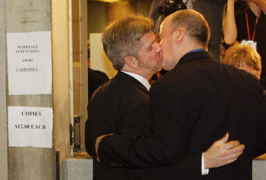 馬薩諸塞州從17日起允許同性戀者在該州登記結婚。當日,馬薩諸塞州市政廳迎來百對準備登記結婚的同性戀新人。