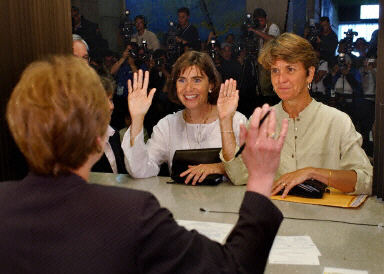 圖為Hillary(R) and Julie Goodridge(R)在馬薩諸塞州市政廳登記結婚。