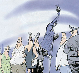 “即便是每個游客后面跟著一個警察,也一定要開放!”紐約市市長布隆伯格說,自由女神像是紐約的象征,一定要爭取在2004年內全面開放。美國自由女神像在9·11事件后緊急關閉。(來源:中國《新聞周刊》)