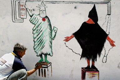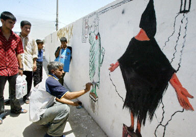 5月23日,一名伊拉克藝術家在巴格達附近的薩德爾城將美軍虐待伊拉克俘虜的照片畫到墻壁上,并在旁邊畫上一個美國“自由女神像”。