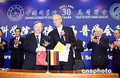 中國科學院與德國馬普學會科學合作三十周年慶祝大會五月二十四日在北京舉行,全國人大常委會副委員長、中科院院長路甬祥與馬普學會主席格盧斯教授在會上簽定“柏林宣言”及“聯(lián)合建所意向書”。作者:徐曦弋