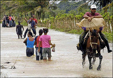 中新網(wǎng)5月26日電 多米尼加西部發(fā)生洪水。圖為人們?cè)诒缓樗蜎]的道路上行走。(固山)