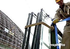 天吊緩緩開動,這塊大玻璃也徐徐升起。這時候參加安裝的20多名施工人員,已經爬到了大劇院北側幕墻第四層的指定位置來迎接這塊大玻璃。