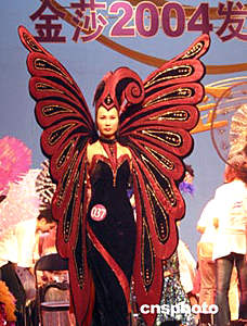 南京金莎二零零四發(fā)型化妝大賽上的水果妝金莎二零零四發(fā)型化妝大賽五月二十七日在南京紫金大戲院舉行,來自江蘇美容美發(fā)業(yè)的二百多名選手參加了剪吹、新娘化妝、形象設(shè)計等環(huán)節(jié)的比賽。作者:孫愛華