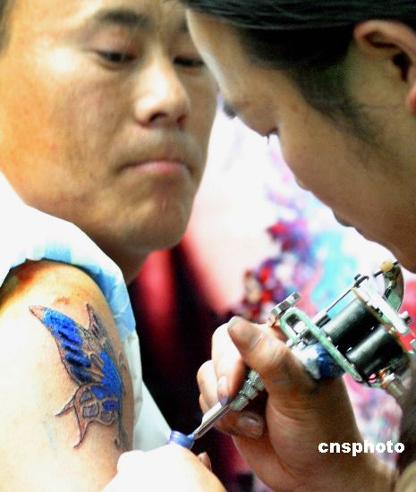 6月1日,南京湖南路一家美容店內,美容師為一名男士在胳膊上紋上一只“造價”500元的彩蝶。隨著夏天臨近,新潮的男士們也想在自己的身體上秀一把。DD 攝