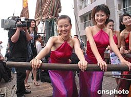 南京剛剛選出的“金陵新十二釵”來到下關碼頭,為電視片《鄭和下西洋》攝制組的“鄭和寶船”升帆啟航助興。美女與古帆船成了媒體關注的焦點。作者:丁東升