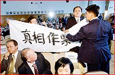 圖文:呂秀蓮境外演說遭前武官扯白布條當眾抗議
