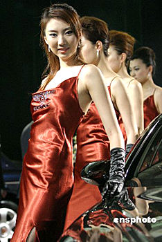 6月9日是2004年北京國際汽車展覽會開幕前一天的新聞日,一批名模出現在名車展臺,在各大汽車廠商推出的精彩節目中亮相。魯谷 攝