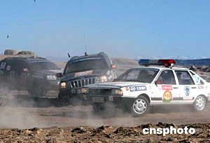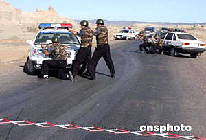 六月五日,“首都警察北京--新疆越野追擊技戰術演練賽”車隊抵達新疆克拉瑪依魔鬼城進行設卡圍追設卡攔截抓捕演練。中新社記者:任海霞