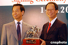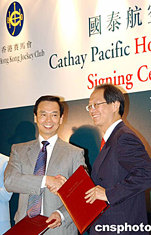 香港國泰航空于6月14日與香港賽馬會(huì)簽訂一份為期三年的合約,贊助香港賽馬會(huì)舉辦 “香港國際賽事”。圖為香港賽馬會(huì)行政總裁黃至剛[左]向香港國泰航空董事兼常務(wù)總裁陳南祿贈(zèng)送賽馬會(huì)禮物。中新社記者:趙振清