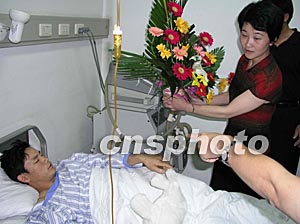 六月十六日中午 ,江西省廣豐縣政府一行六人專程赴濟(jì)慰問正在山東省立醫(yī)院接受救治的在阿受傷工人。圖為廣豐縣副縣長祝美清(持花者)在看望受傷的江西籍工人徐啟松。作者:胡洪林