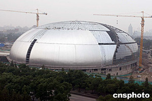 六月十九日,施工人員正在加緊安裝國(guó)家大劇院的外墻玻璃,備受矚目的國(guó)家大劇院整體形象初露端倪。中新社記者:毛建軍