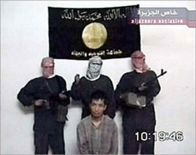 卡塔爾半島電視臺6月20日播放了一盤據(jù)稱是來自伊拉克武裝分子的錄像帶。在錄像帶中,綁匪要求韓國從伊拉克撤出軍隊,否則將砍掉韓國人質(zhì)的頭。