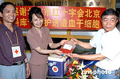 六月二十二日晚,中國造血干細胞捐獻者資料庫北京管理中心主任金輝(中)福建醫科大學附屬協和醫院主任醫師陳志哲(右)移交北京首例在校大學生骨髓捐獻者造血干細胞,以緊急用于該院福建十三歲少年謝輝骨髓移植手術。作者:劉可耕
