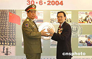 中新網6月30日電 香港郵政今日發行“中國人民解放軍駐香港部隊”特別郵票。發行儀式今早在香港郵政總局舉行,香港郵政署長蔣任宏與中國人民解放軍駐香港部隊參謀長王玉仁少將一同在巨型首日封上蓋印,象征郵票正式發行。