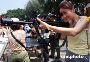 為慶祝香港回歸祖國七周年,中國人民解放軍駐香港部隊于七月一日舉行三軍軍營開放活動,在赤柱軍營參觀者對各種武器展示充滿興趣。作者:錢興強
