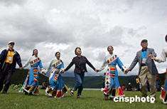 七月四日,參加情系香格里拉——兩岸文化聯誼行活動的兩岸四地文化界人士來到美麗的云南香格里拉屬都湖,體驗藏族鍋莊舞的自然、豪放。中新社記者:武仲林
