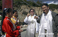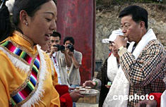 七月五日,參加情系香格里拉——兩岸文化聯誼行活動的兩岸四地文化界人士來到德欽,受到當地藏族同胞的熱烈歡迎。圖為臺灣金門縣縣長李炷烽先生品嘗藏族姑娘敬獻的青稞酒。中新社記者:武仲林