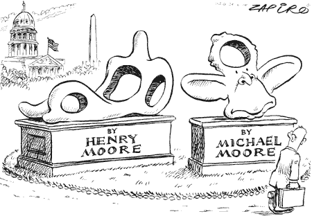 中新網7月5日電 約翰內斯堡媒體Mail & Guardian近日刊登了這副漫畫,向讀者展示了兩件藝術作品:一個是邁克爾·摩爾的電影《華氏911》,一個是雕塑家亨利·摩爾的雕塑作品《沉睡中的女人》。
