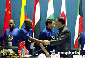 為期十天的第二十八屆世界遺產委員會會議七月七日在蘇州順利閉幕。閉幕式上通過了下屆世遺大會主席的選舉議程,南非的丹巴·瓦卡什當選第29屆世界遺產委員會會議的主席。圖為章新勝與丹巴·瓦卡什握手(左)。作者:蔣振江
