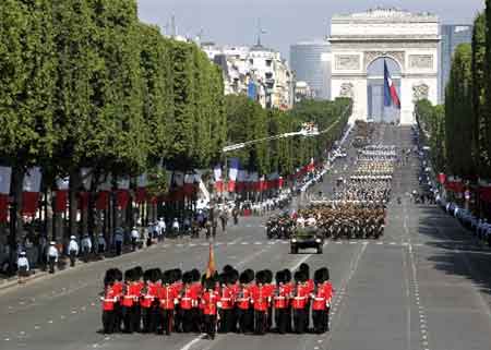 據法國媒體報道,共有3936名身穿紅色制服、頭戴黑色軟帽的士兵參加了閱兵隊伍。閱兵式動用了64架戰機,31架直升機,51個方隊,305輛軍車,83輛摩托,310匹戰馬和350名軍樂手。