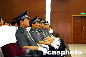 “一二·二三”特大井噴事故案今天繼續在重慶市第二中級人民法院進行庭審,該庭審已進入第二天。圖為法庭上的法警。作者:鄒輝
