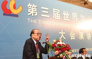 七月十六日,印尼融僑房地產(chǎn)有限公司董事長(zhǎng)林文鏡在《第三屆世界華人論壇》上作《橋梁·向?qū)?#183;融合劑》的大會(huì)演講。中新社記者:史利