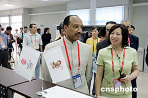 二零零四年亞洲杯足球賽七月十七日晚在北京工人體育場開幕,開幕式前,亞足聯主席哈曼在工作人員陪同下考察新聞中心等設施。中新社記者:毛建軍