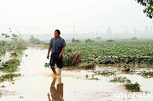 七月十八日,澧河河南省舞陽段村民走在自家被水淹沒的莊稼地中。作者:慎重