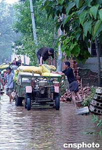 七月十八日,澧河河南省舞陽段村民從家中搬運糧食。作者:史寶銀
