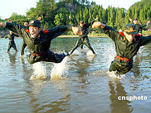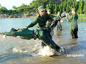 7月18日,浙江省仙居縣武警官兵頂著烈日,冒著酷暑進行水上高難項目訓練。為適應水上戰斗能力,仙居縣武警官兵頂著烈日,開始進行為期15天的水上訓練。華文武 攝