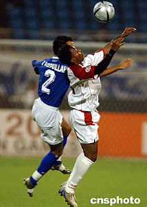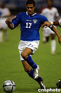 7月19日晚,2004年亞洲杯B組科威特隊(duì)與阿聯(lián)酋隊(duì)的比賽在濟(jì)南山東省體育中心開戰(zhàn)。科威特隊(duì)(藍(lán))發(fā)揮出色,最終以3比1大勝阿聯(lián)酋隊(duì)。中新社記者:武仲林
