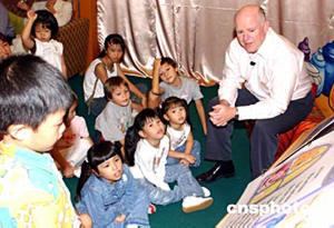 迪斯尼手牽手講故事時間與小朋友共享夏日讀書樂活動20日在香港舉行﹐十五位四至六歲的小朋友聚首一堂﹐在香港迪斯尼樂園集團行政總裁羅彬深先生帶領下﹐一起跳進迪斯尼的繽紛童話世界﹐籍此培養小朋友的讀書興趣。作者:趙振清