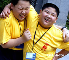 二○○四年七月二十一日,北京舉辦“世紀陽光‘小胖子’均衡營養運動夏令營”活動,參加活動前孩子們合影留念。據悉,北京一些‘小胖子’的家長在暑假期間支付高額費用把孩子送進夏令營,旨在幫助他們減肥。中新社記者:宋吉河