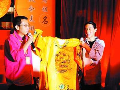 中新網7月24日電 成龍兒子房祖名昨日正式簽約北京太合麥田公司,拉開了其全面進軍內地市場的序幕。在昨天簽約儀式,唱片公司負責人送上龍袍作為見面禮,但害羞的房祖名卻不敢當眾穿上。