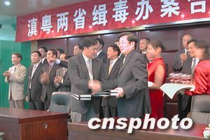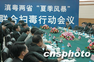 七月二十三日下午,滇粵兩省在昆明舉行“夏季風暴”聯合掃毒行動會議。由廣東省委副書記王華元及副省長李容根率領的廣東禁毒代表團,與中共云南省委常委李明朝、副省長李漢柏等就雙方建立合作機制進行了深入的探討。兩省警方負責人還共同簽署了《滇粵兩省公安機關聯合開展打擊跨區域毒品犯罪專項行動方案》和《滇粵兩省公安機關全面加強緝毒辦案合作協議》。此舉標志著兩省禁毒合作新機制的全面啟動。按照協議,兩省將全面加大緝毒情報交流和辦案執法合作力度,組織偵破一批高質量、跨區域、有組織的制販毒案件并將建立若干合作機制。王華元表示,為加強禁毒工作,廣東省將于近期成立禁毒工作局,增加禁毒力量,并將在各地成立禁毒支隊。與此同時,還將動員全社會的力量嚴厲打擊毒品犯罪活動。中新社納家驊/攝