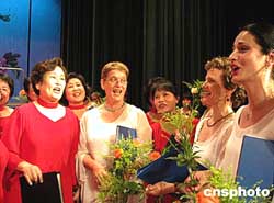 八月二日晚在北京朝陽文化館內,來自以色列娜瑪女子合唱團和北京"鳳朝陽"合唱團的成員們在一起合唱中國民歌"小白菜"。娜瑪女子合唱團是以色列當今最領先的聲樂團體之一,并在江蘇無錫舉辦的第七屆中國國際合唱節上獲一等獎。作者:韓藝冰