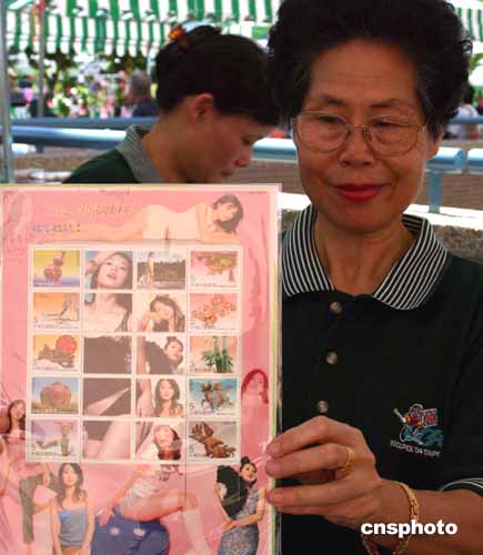 臺灣第一名模林志玲的個人化郵票八月六日亮相臺北郵展,二千五百張郵票很快銷售一空。圖為一名郵局工作人員展示林志玲個人郵票。中新社記者:董會峰