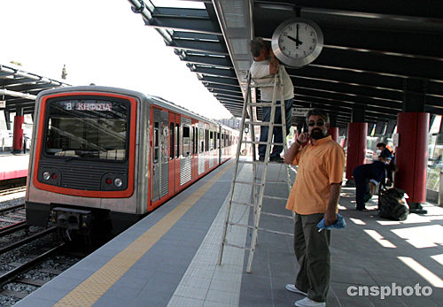 通往雅典奧運會主會場的輕軌鐵路雖然已經(jīng)通車多日,但是多項收尾工程至今未完成。當?shù)貢r間8月7日清晨,希臘工人依照傳統(tǒng)習俗不緊不慢地在站臺調(diào)試一直沒有運行的時鐘。中新社記者:任晨鳴