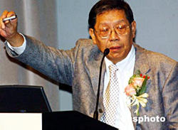 圖為臺灣出席論壇的師化民發(fā)表演講,講述組織專家小組赴美對臺灣三.一九槍擊案進行測試查驗結(jié)果。