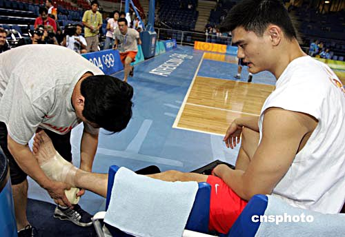 “姚明來了!”一聲聲欣喜的驚呼后,各路老記從不同的方向奔向已在休息長椅上坐下的姚明。姚明在隊(duì)醫(yī)的協(xié)助下往腳上裹纏紗布的畫面被無數(shù)的照相機(jī)和攝影機(jī)攝入鏡頭。