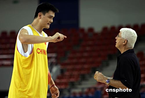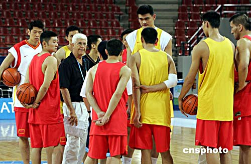 當(dāng)滿頭銀發(fā)的中國男籃主帥哈里斯姍姍出現(xiàn)在訓(xùn)練館內(nèi)時(shí),隊(duì)員們開始集合,此時(shí)比預(yù)定的訓(xùn)練時(shí)間晚了半個(gè)多小時(shí)。在例行的熱身活動后,中國男籃分成黃、紅兩隊(duì)進(jìn)行了幾套戰(zhàn)術(shù)的演練。由姚明、易建聯(lián)、李楠、劉煒、朱芳雨等組成的黃隊(duì)無疑是中國男籃的主力陣容。