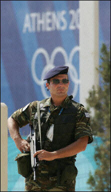 一名希臘士兵在雅典奧運賽場前巡邏(法新)