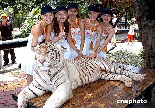 八月十五日,第五屆明日之星影視新星的入選選手來到廣州番禺香江野生動物世界拍攝外景。圖為美女與白老虎合影。作者:劉衛(wèi)勇