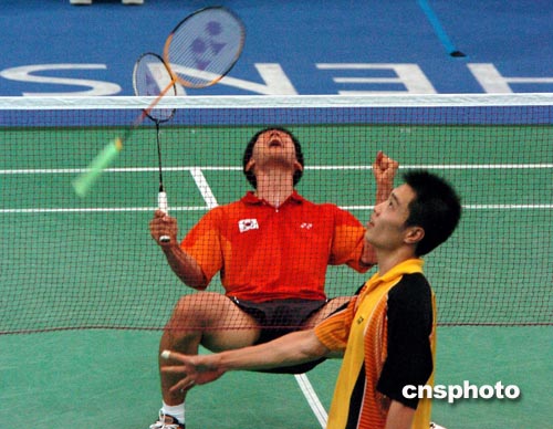 中國羽毛球男單選手陳宏(前)在雅典奧運會羽毛球男子單打比賽中以一比二不敵韓國選手孫升模無緣四強。作者:陳佳